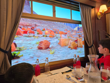 I'd also like to mention one huge difference between Wonder of the Seas and Utopia. The Royal Railway. My kids and I were super excited to try out this brand new venue. For those that don't know, the Royal Railway is an immersive dining experience. You "board" a train complete with virtual windows, sounds, and vibrations to simulate the experience of actually being on a train. The dining experience even includes a show with sheriffs and bandits!