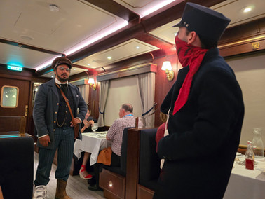 The entrance to the venue has an old-style departures flipboard that includes the last names of all the guests booked on the train. You're then escorted onto the train platform where you're served a cherry-flavored drink in a old-style bottle. They had non-alcoholic versions for the kids.